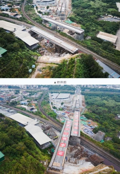 當(dāng)天7時04分,轉(zhuǎn)體橋梁開始轉(zhuǎn)體,經(jīng)過44分鐘施工,成功完成高空“二人轉(zhuǎn)”,為下一步順利實現(xiàn)通車運營奠定堅實基礎(chǔ)。轉(zhuǎn)體橋上跨既有漳龍線、龍東線及煤場專用線3條鐵路貨運營業(yè)線,距離營業(yè)線最近距離僅5.9米,施工難度大,危險系數(shù)高。