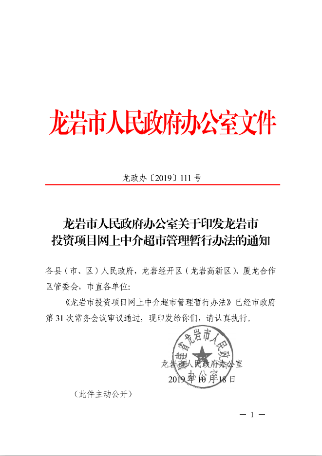 龍巖市人民政府辦公室關(guān)于印發(fā)龍巖市投資項(xiàng)目網(wǎng)上中介超市管理暫行辦法的通知(龍政辦[2019]111號(hào))