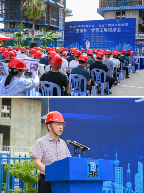 為推動(dòng)我市房屋市政工程智慧工地建設(shè),促進(jìn)建筑施工企業(yè)質(zhì)量安全管理標(biāo)準(zhǔn)化、信息化、智能化發(fā)展,7月20號(hào)上午,由市住建局和城發(fā)集團(tuán)主辦,市政集團(tuán)及福建九鼎集團(tuán)共同承辦的全市智慧工地觀摩會(huì)在龍欣小區(qū)安置房二期Ⅱ標(biāo)段項(xiàng)目舉辦,市住建局二級(jí)調(diào)研員王健蒞臨觀摩會(huì)致辭,市住建局、城發(fā)集團(tuán)及所屬企業(yè)相關(guān)工程技術(shù)人員約100人參加。觀摩會(huì)還吸引了來(lái)自龍巖市建筑業(yè)協(xié)會(huì)、龍巖市工程建設(shè)質(zhì)量安全管理協(xié)會(huì)、福建船政交通職業(yè)學(xué)院等有關(guān)專(zhuān)家到場(chǎng)指導(dǎo)。